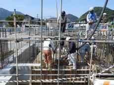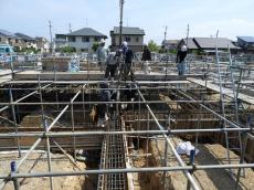 コンクリートを均しながら打っていきます。これをしないとコンクリートが均等に流し込まれず、欠陥の原因になってしまいます。2枚目はその様子です。